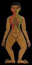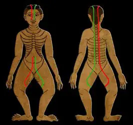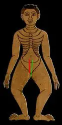 Sukumang (зеленая линия) — начинается в точке на 2 пальца ниже пупка и немного левее, идет вниз и выходит через анус.