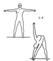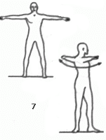 Повороты корпуса. Исходное положение то же. Вдох — повернитесь влево, не опуская рук. Выдох — вернитесь в исходное положение. Вдох повернитесь вправо, выдох — вернитесь в исходное положение. Руки остаются выпрямленными и параллельными полу. На каждый поворот 2-3 секунды.