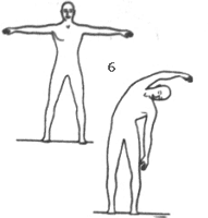 Наклоны в сторону. Встань прямо, ноги врозь, руки разведены в стороны параллельно полу ладонями вниз. Сделайте вдох и наклонись от пояса влево, левую руку отпусти вдоль тела вниз, правую поднимите вверх. Не прогибайся в пояснице. Выдох — вернись в исходное положение. Затем повтори в другую сторону. На каждый наклон 6 секунд