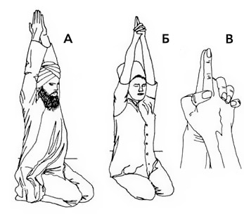 2. Переплетите между собой все пальцы, кроме указательных, которые смотрят прямо вверх (В). Когда у вас появится опыт, вы сможете держать ладони в мудре молящегося.(А)