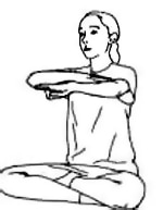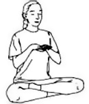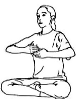 ПОЗА: Сядь в простую позу со скрещеными впереди ногами, легкая джаландхара бандха. Локти вдоль тела, кисти рук соприкасаются внешними сторонами указательных пальцев, большой палец правой руки под левым, ладони смотрят вовне, начинается движение с ладонями, смотрящими вниз.
