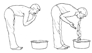Затем встаньте, ноги вместе, наклонитесь над краем ванны, унитазом или большим тазом под углом 90 градусов. Положите ладонь левой руки на живот, слегка надавливая на него. Указательным, средним и безымянным пальцами правой руки надавите на корень языка глубоко в глотке. Как только начнёт вода выходить, уберите пальцы изо рта и позвольте воде полностью выйти. Используйте пальцы вновь если вода более не вытекает. Если, несмотря на движения пальцев, вода больше не выходит, и вы только вызываете тошноту, не извергая воду, это значит, что желудок пуст, и можно прекратить упражнение.