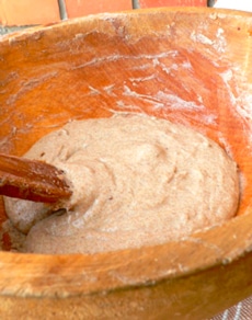 1 стакан пшеницы для проращивания, прорастить ее (промыть, залить на сутки чистой водой, потом разложить зерна на плоской поверхности и сверху накрыть мокрой тканью, следить за тем, чтобы ткань не высыхала полностью, проростки обычно появляются на 2 сутки), затем все перемолоть (лучше получается на мясорубке) и смешать с 1 стаканом ржано-обдирной муки (если ее нет, то можно взять простой пшеничной муки), добавив немного воды, чтобы получилась кашица. Туда же положить 2 стол. ложки сахара. Потом эту кашицу надо варить, помешивая, в кастрюльке на медленном огне около 1 часа, чтобы кашица стала темной и клейкой (напоминает кашицу из размоченного в кипятке черного хлеба). После этого переложить ее в чистую кастрюлю и поставить в теплое место на 1-2 суток, чтобы каша прокисла. Когда она прокисает, то появляются пузырьки на поверхности и характерный запах свежего хлебного кваса. хлеб_без_ дрожжей_ 2После закисания каши, чтобы увеличить массу закваски, надо в кастрюлю добавить еще 1-1,5 ст. муки (лучше ржано-обдирной), немного воды и сахара 1-2 ст. ложки, и замешать так, чтобы получилось тесто, не сильно жидкое и не густое, все это снова надо поставить на ночь в теплое место, а утром уже можно брать часть из этой закваски на хлеб, а остальное поставить в холодильник. Там закваска тоже потихоньку скисает, поэтому каждый раз, как берете от закваски часть на хлеб, туда надо досыпать муки и добавлять воды и сахара, чтобы закваска продолжала свое существование. Теперь ее уже все время надо держать в холодильнике. Она там понемногу поднимается, используя для этого новую муку и сахар.